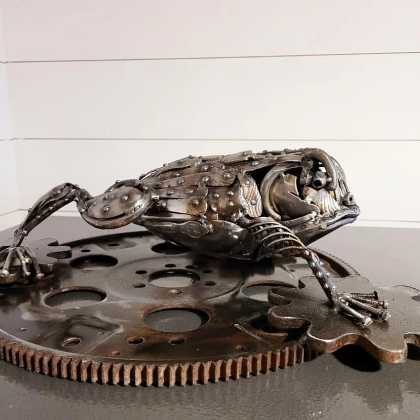 An irate toad fusing feral wrath with steampunk precision.