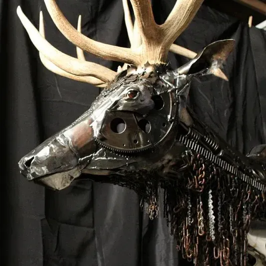 A majestic elk head embodying untamed grace amid mechanical rebirth.