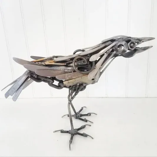A resilient crow sculpted from salvaged metal, evoking rebirth and craft.