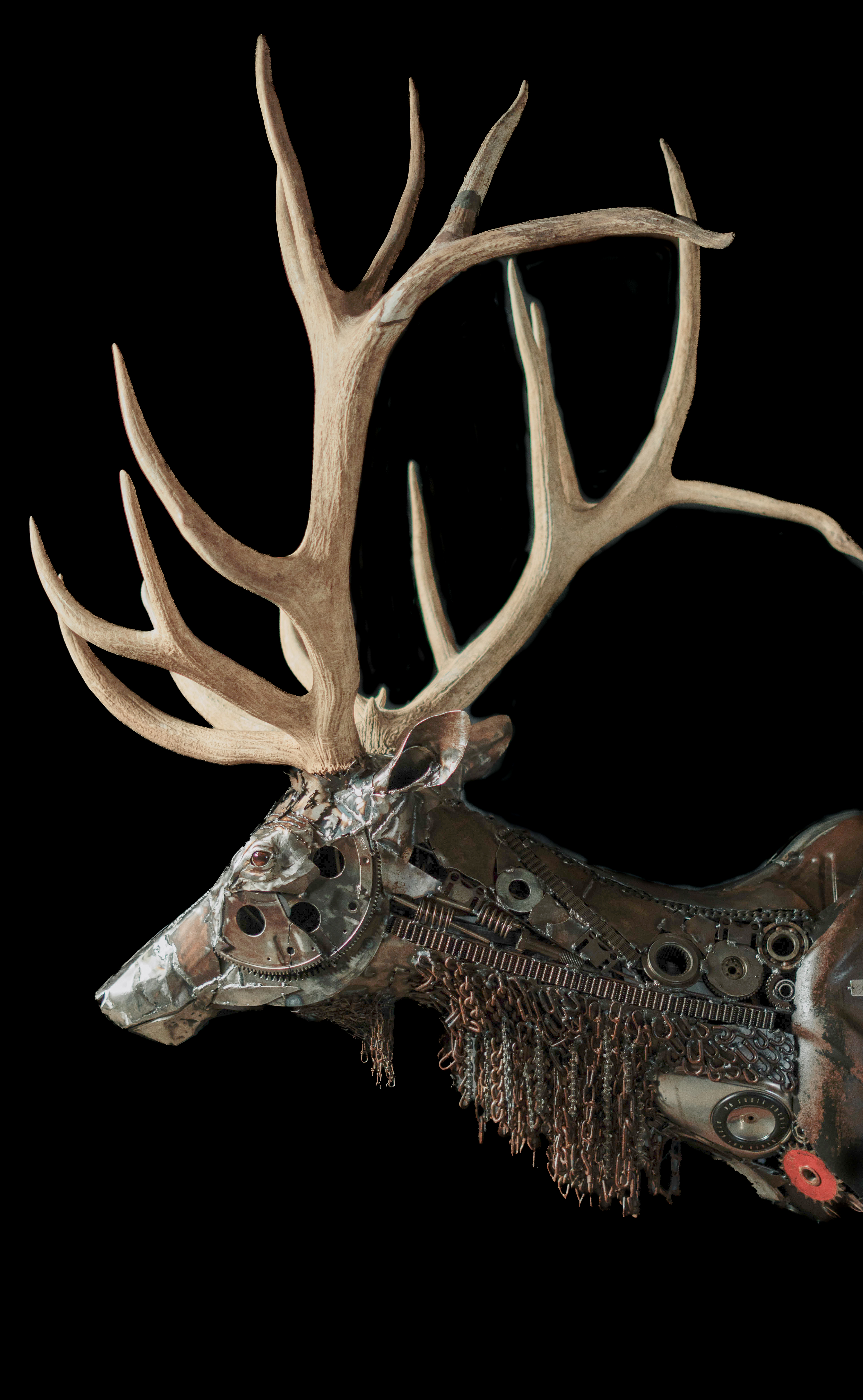 A majestic elk head embodying untamed grace amid mechanical rebirth.