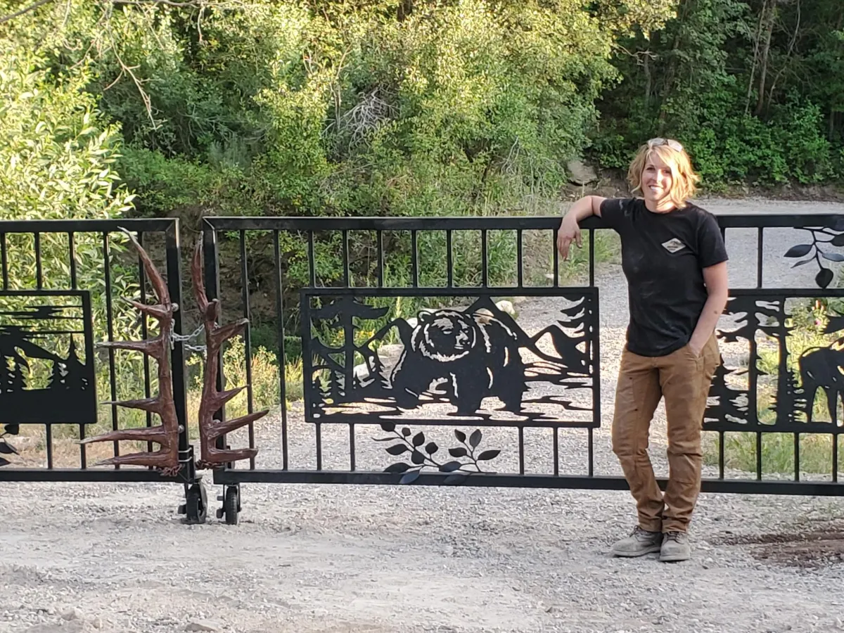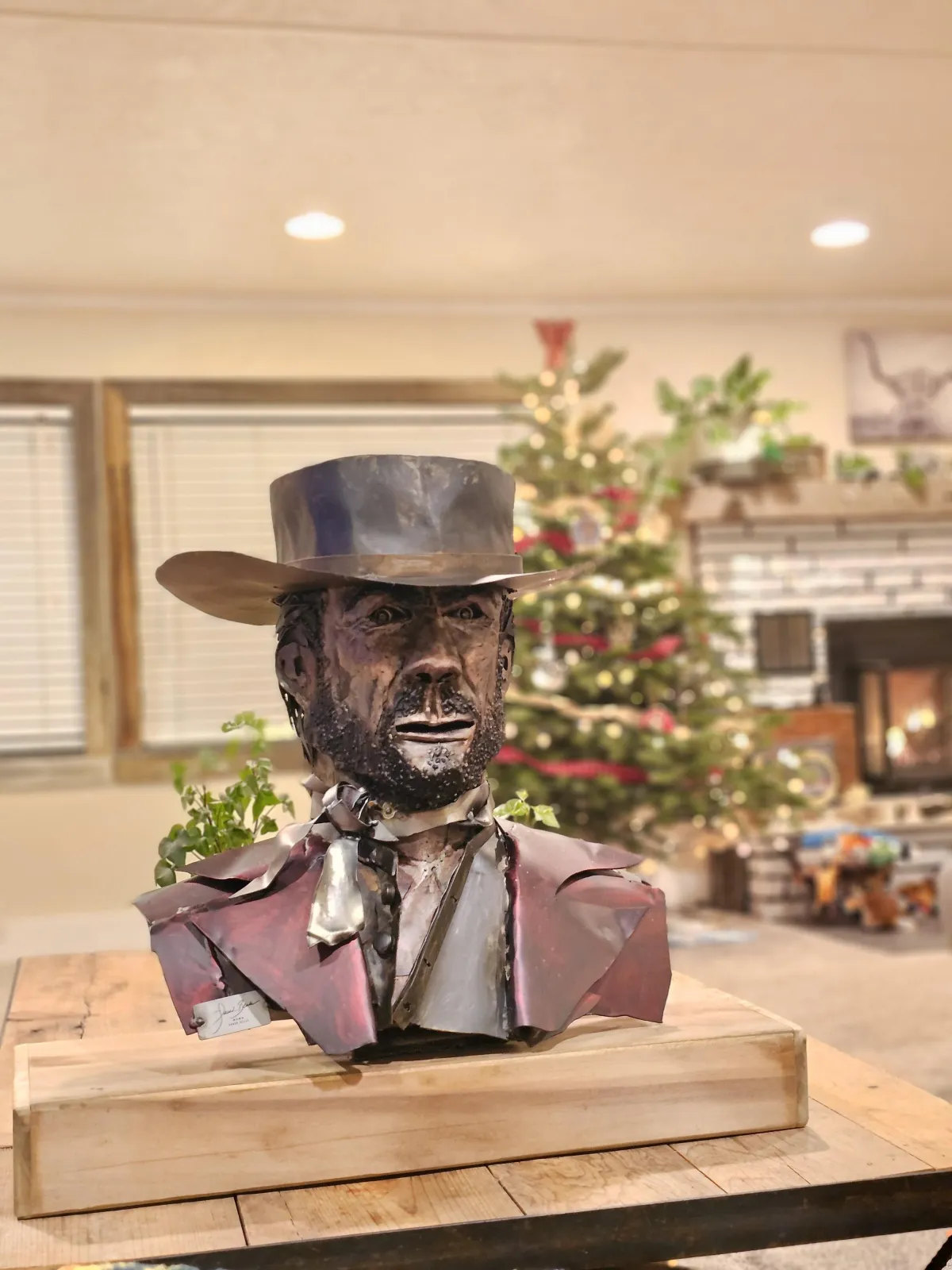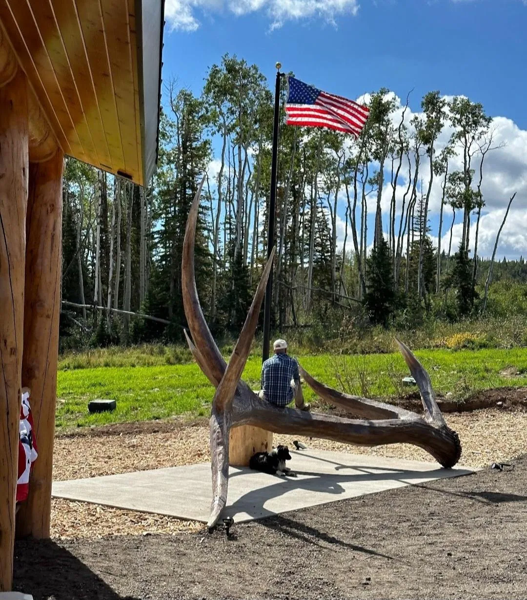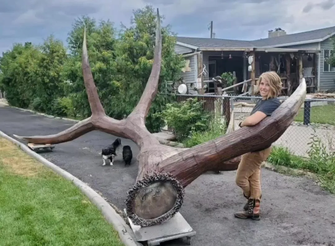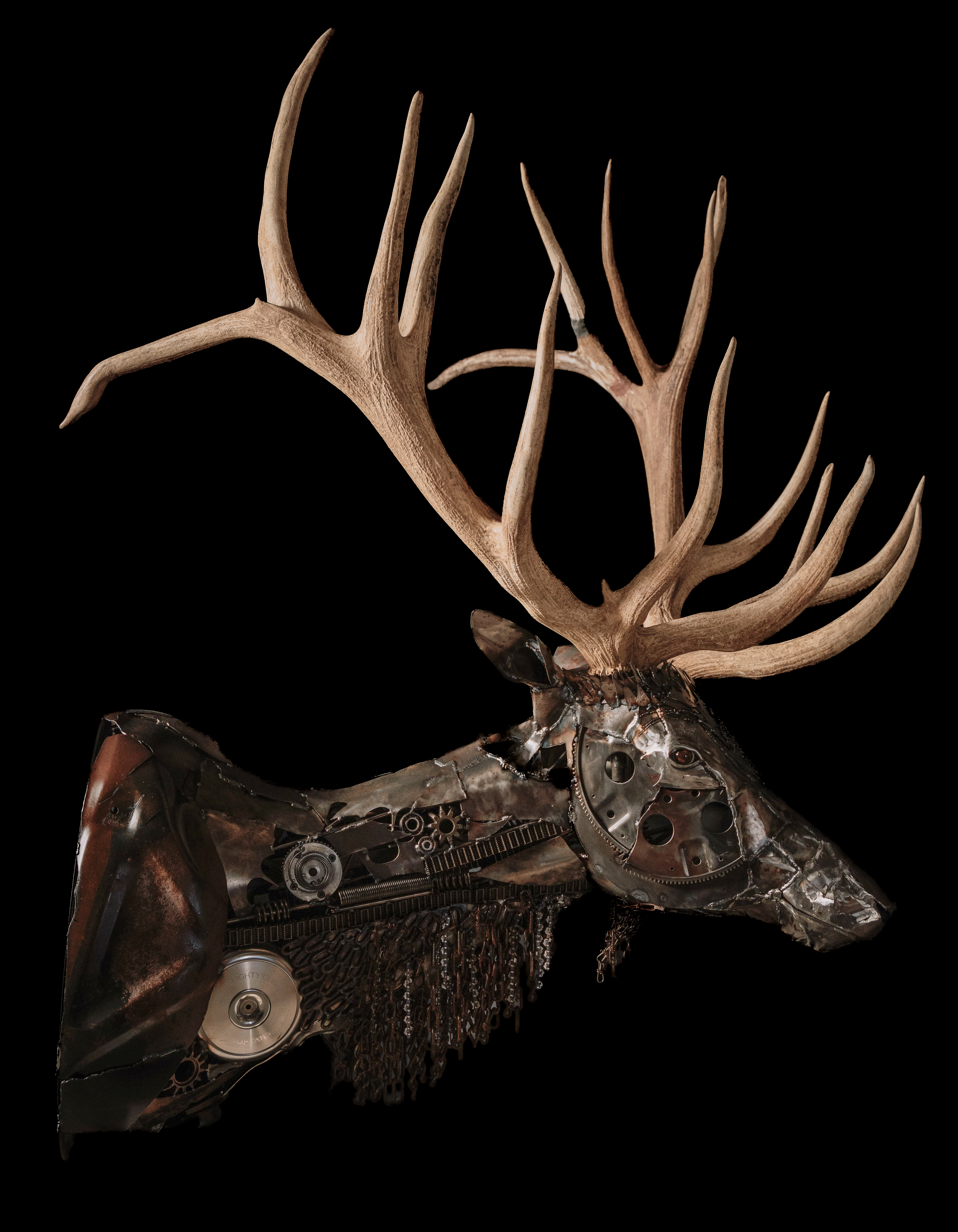elk sculpture made with scrap steel and real adjustable antlers